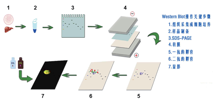 免疫印跡(Immunoblotting)又稱蛋白質印跡(Western Blot,WB),是一種綜合性的免疫學檢測技術。它利用SDS-PAGE技術將生物樣品中的蛋白質分子按分子量的大小在凝膠上分離開,然后用電轉移的方法將蛋白轉移到固相膜上,以固相膜上的蛋白質作為抗原,與對應的抗體起免疫反應,再與酶標記的第二抗體起反應,經過底物顯色或熒光成像等方法以檢測電泳分離的特異性目的基因表達的蛋白質。WB技術現(xiàn)已廣泛應用于蛋白水平的表達研究、抗體活性檢測和疾病早期診斷等多個研究領域。