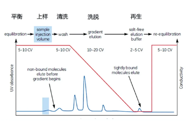 離子交換層析是基于蛋白質(zhì)和離子交換層析介質(zhì)之間的電荷相互作用進(jìn)行分離。離子交換層析介質(zhì)通常帶有正或負(fù)電荷,吸附帶有相反電荷的蛋白質(zhì)。通過調(diào)整緩沖液的離子濃度或pH值,可以改變蛋白質(zhì)與介質(zhì)的結(jié)合強(qiáng)度,實現(xiàn)不同蛋白質(zhì)的分離。